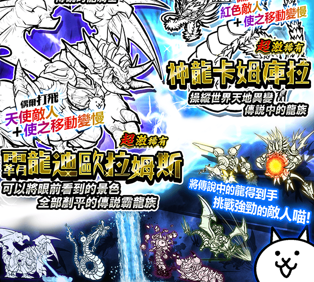 ※「超激角色1隻確定活動」進行中時,以消費貓罐頭方式使用11連續轉蛋則保證一定會出現該系列轉蛋的超激角色1隻以上。