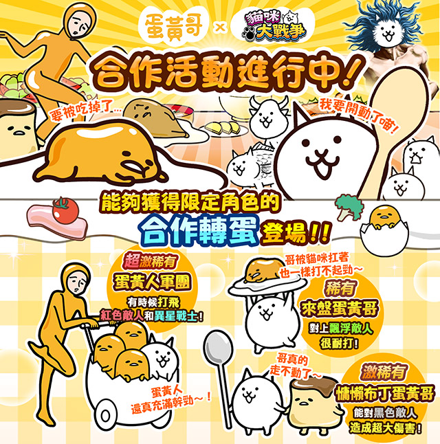※「超激角色1隻確定活動」進行中時,以消費貓罐頭方式使用11連續轉蛋則保證一定會出現該系列轉蛋的超激角色1隻以上。