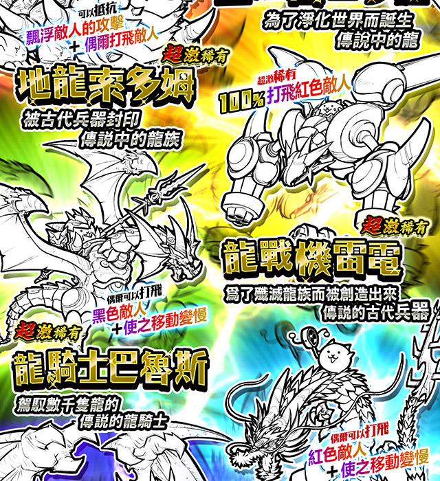 ※若有舉辦「超激角色1隻確定活動」,以消費貓罐頭方式使用11連續轉蛋則保證一定會出現該系列轉蛋的超激角色1隻以上。關於「超激角色1隻確定活動」的舉辦時間,請參考遊戲内公告或稀有轉蛋畫面的提示。