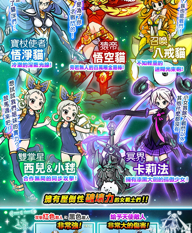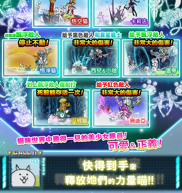 貓咪陰陽師, 超能力貓, 人魚貓, 搖滾貓, 發條貓, 高蹺貓, 神槍手貓, 魔劍士貓, 弓箭手貓, 魔女貓, 薩滿貓, 占卜貓, 僧侶貓, 小偷貓, 海賊貓, 鬥士貓, 侏羅貓, 美容貓, 車輪貓, 跳跳貓, 樹剪貓, 拳擊手貓, 貓咪探測器