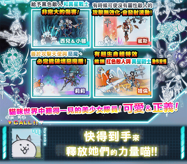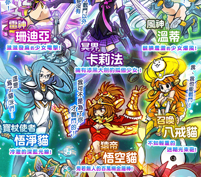 跳跳貓, 車輪貓, 美容貓, 侏羅貓, 鬥士貓, 海賊貓, 小偷貓, 僧侶貓, 占卜貓, 薩滿貓, 魔女貓, 弓箭手貓, 魔劍士貓, 神槍手貓, 高蹺貓, 發條貓, 搖滾貓, 人魚貓, 超能力貓, 貓咪陰陽師, 樹剪貓, 拳擊手貓, 貓咪探測器, 鬥牛士貓, 貓咪格鬥家