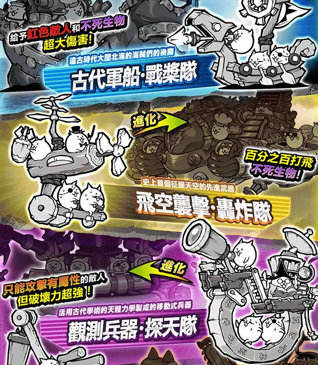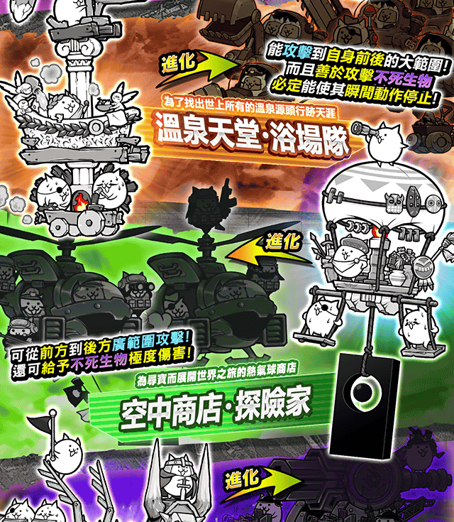 跳跳貓, 車輪貓, 美容貓, 侏羅貓, 鬥士貓, 海賊貓, 小偷貓, 僧侶貓, 占卜貓, 薩滿貓, 魔女貓, 弓箭手貓, 魔劍士貓, 神槍手貓, 高蹺貓, 發條貓, 搖滾貓, 人魚貓, 超能力貓, 貓咪陰陽師, 樹剪貓, 拳擊手貓, 貓咪探測器, 鬥牛士貓, 貓咪格鬥家