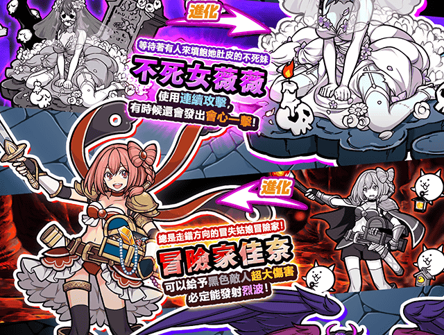 跳跳貓, 車輪貓, 美容貓, 侏羅貓, 鬥士貓, 海賊貓, 小偷貓, 僧侶貓, 占卜貓, 薩滿貓, 魔女貓, 弓箭手貓, 魔劍士貓, 神槍手貓, 高蹺貓, 發條貓, 搖滾貓, 人魚貓, 超能力貓, 貓咪陰陽師, 樹剪貓, 拳擊手貓, 貓咪探測器, 鬥牛士貓, 貓咪格鬥家
